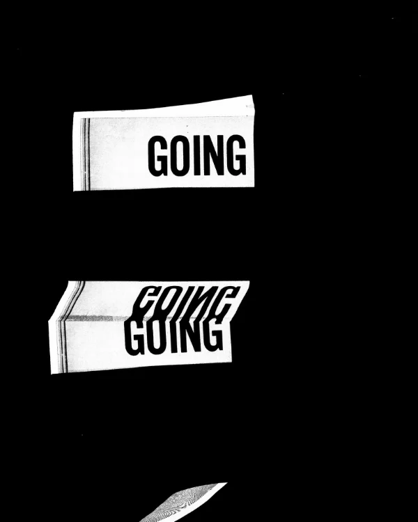 Image courtesy of Kameelah Janan Rasheed. [Image Description: A large black print with the word “GOING” repeated three times. The word “GOING” is cut from a photocopy of a magazine and or a book. The top cut out is shaped like a trapezoid while the two towards the bottom are mirrored and connected at their mirroring. Where they are connected also mimics the crease of a book.]